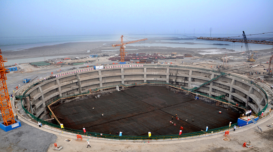 黄骅电厂一期工程排水口工程中的排水管沟采用沉埋法施工。排水管沟先在干坞里制作完成需沉放的管沟段,管沟段两端用临时封墙密封,待混凝土强度达到设计强度后浮运到排水管沟址位置,并沉放管段。待沉放完毕后再恢复南大堤。