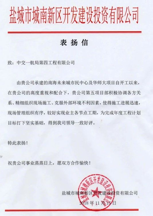近日,公司第五项目部承建的江苏盐城南海未来城市民中心及华师大项目获业主单位盐城市城南新区开发建设投资有限公司致信表扬。