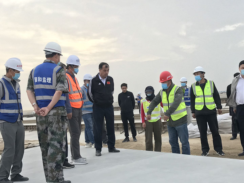 在施工现场,吐尔逊江·阿合买提一行听取了项目复工达产、疫情防控以及文明施工等方面的情况汇报。在实际观摩现场工人作业和跑道感观质量后,吐尔逊江·阿合买提对项目进展和工程质量控制表示满意,鼓励建设者要继续努力不放松,确保防疫和生产同步同向,助力于田打赢脱贫攻坚战。