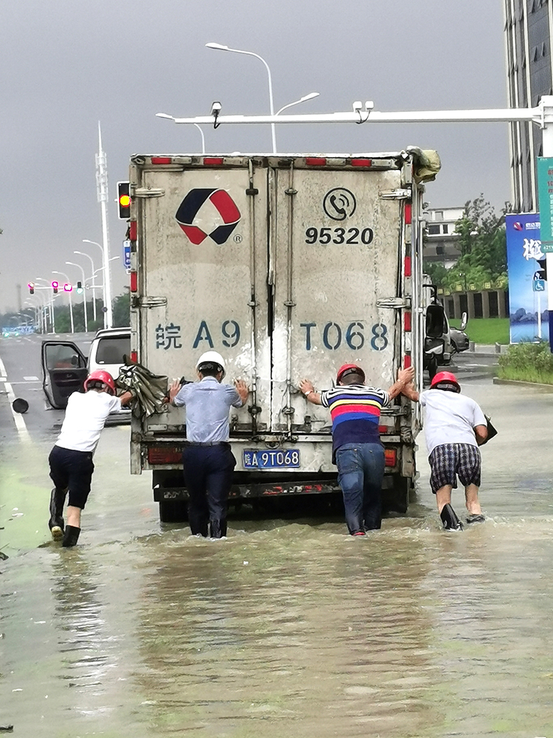 项目联合业主单位共同行动,成立抗洪抢险应急突击队,先后调用多台水泵、装载机、运输沙石料和交通运输车辆,组织100余人第一时间赶到水淹路段协助地方政府、社区抗洪抢险。项目突击队员冒着大雨蹚水而行,用人力将一辆辆车推出泡水区域,确保政府大型抗洪救援机械顺利通过,组织人员协助交警部门及时疏散群众,疏通下水道、清理井口杂物、清扫积水。