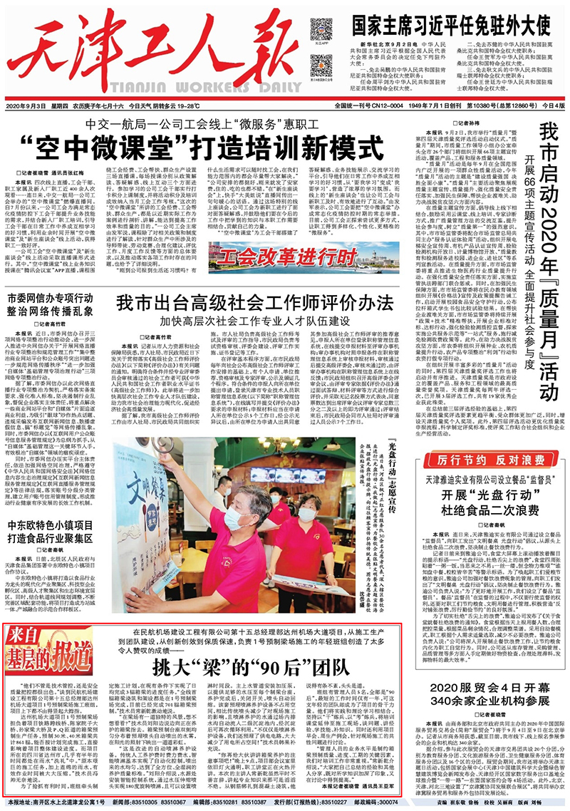 9月3日,《天津工人报》头版“来自基层的报道”栏目,以《挑大“梁”的“90后”团队》为题,对公司第十五总经理承建的达州机场大道项目1号预制梁场施工班组事迹进行了专题报道。