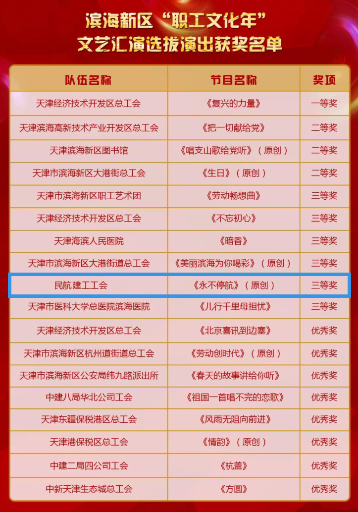 11月5日,天津市滨海新区“职工文化年”文艺汇演选拔赛在滨海文化中心举办,来自滨海新区各基层工会推荐的共41个节目精彩上演,公司原创歌曲《永不停航》获三等奖。