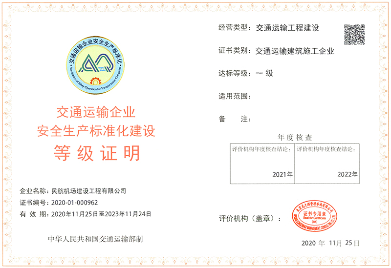 日前,经交通运输企业安全生产标准化管理系统相关公示,公司顺利通过交通运输建筑施工企业安全生产标准化建设一级达标复评审核。