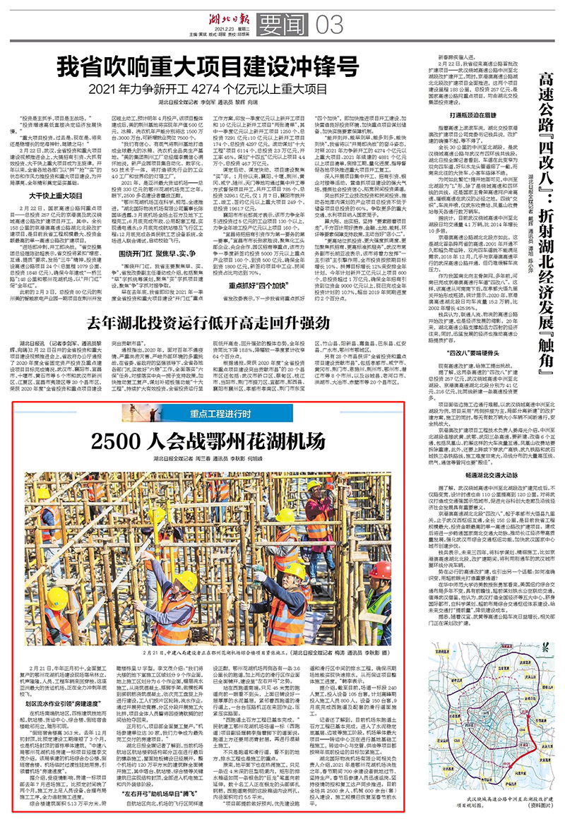 2月23日,《湖北日报》第25874期三版“重点工程进行时”以《2500人会战鄂州花湖机场》为题,对第十一总经理部承建的鄂州花湖机场场道一标段项目“左右开弓”助机场早日“腾飞”的建设事迹进行报道。此外,央广网、中新网、东楚网等媒体对此也进行了转载报道。