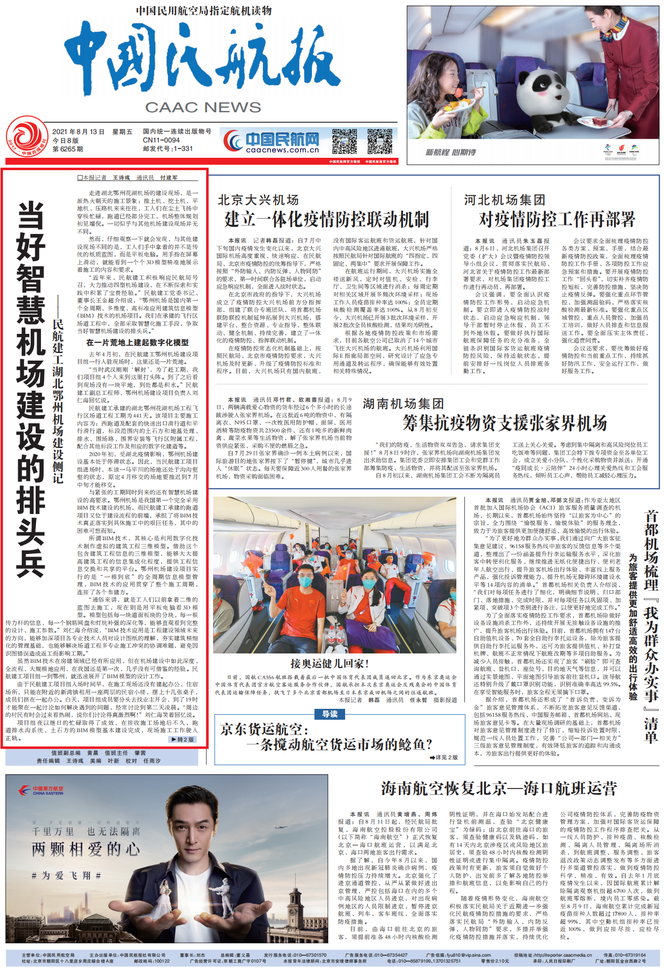 8月13日,《中国民航报》第6265期刊发头版头条文章,以《当好智慧机场建设的排头兵——民航建工湖北鄂州机场建设侧记》为题,对公司第十一总经理部承建的湖北鄂州花湖机场飞行区场道工程一标段数字化施工与BIM应用及项目整体建设情况等进行了专题深度报道。