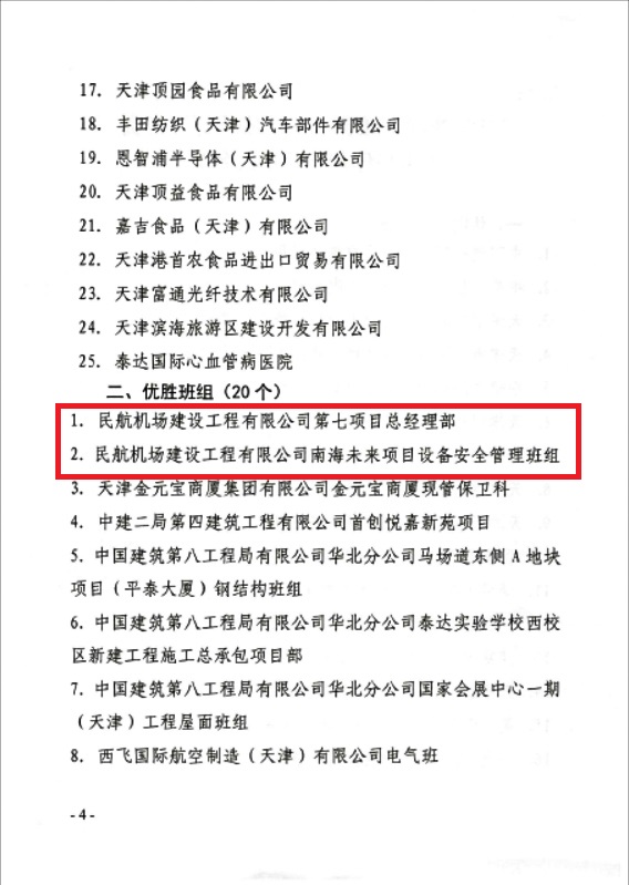近日,由天津市滨海新区总工会、滨海新区经济管理局、滨海新区卫生健康委员会联合开展的2019-2020年度天津市滨海新区“安康杯”竞赛落下帷幕,公司第五总经理部南海未来城项目设备安全管理班组和第七总经理部分获2019-2020年度天津市滨海新区“安康杯”竞赛优胜班组荣誉称号。